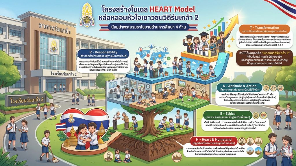 - H – Heart & Homeland (ปลูกฝังหัวใจรักชาติและภูมิใจในท้องถิ่น) การออกแบบในส่วนนี้ มุ่งเน้นการสร้างทัศนคติที่ถูกต้องต่อบ้านเมือง โดยเริ่มต้นจากการใช้ “หัวใจ” เข้าถึงผู้เรียน เพื่อบ่มเพาะความรักในสถาบันหลักของชาติและรากเหง้าของตนเอง
